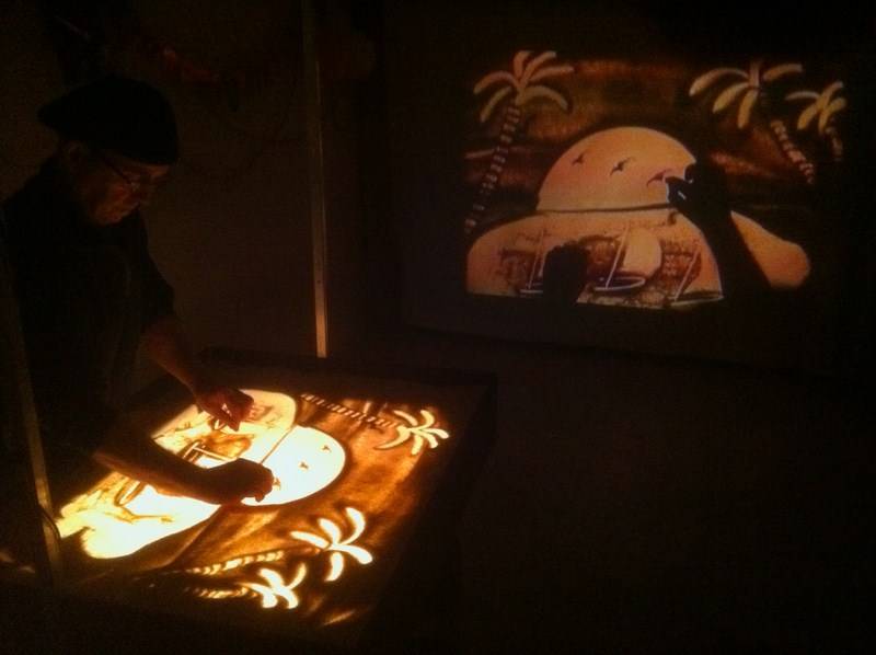 Le dessin sur sable se fait sur une table lumineuse, une caméra placée au dessus de l’artiste filme l’évolution des dessins et l’ensemble est projeté sur grand écran.