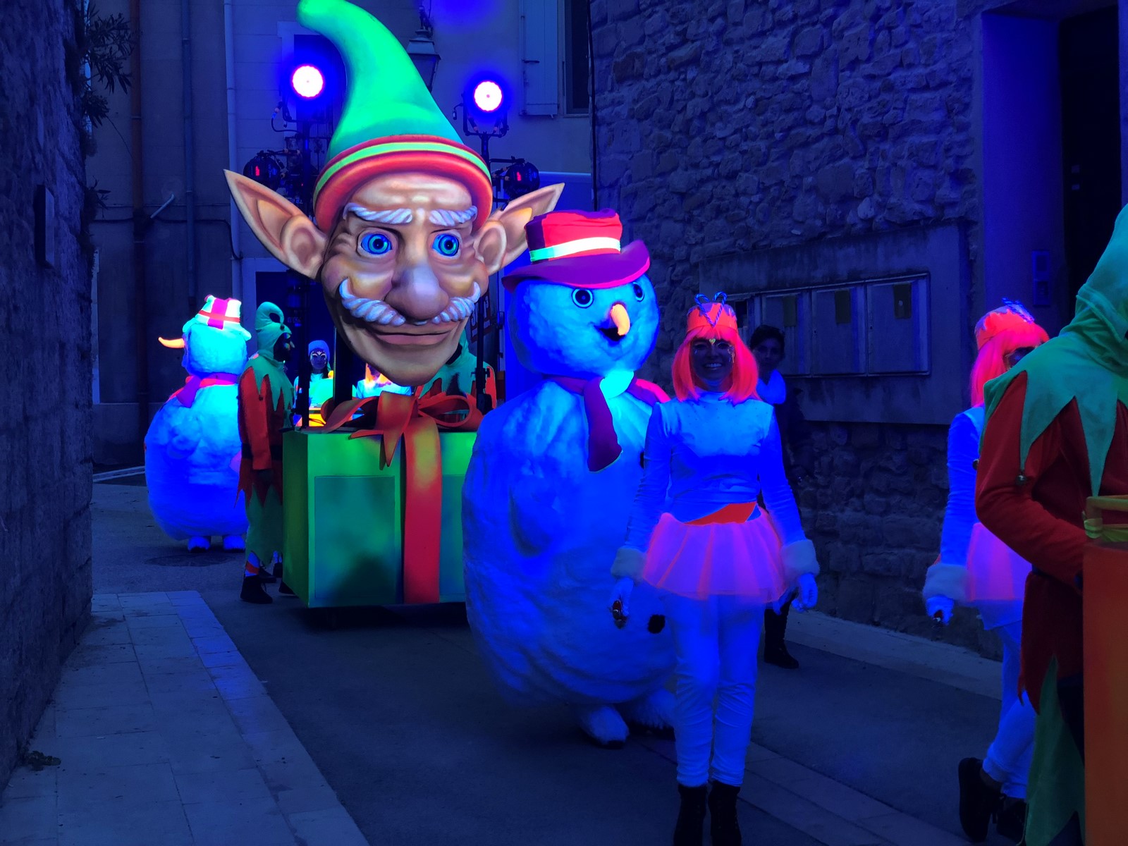 les costumes des différents personnages:mascottes, lutins, grands pantins lutins, fées des glaces, flocons de neige, mais aussi le traineau du Père Noël et sa boite aux lettres, les chariots sonorisés "Cadeaux Lutins" réagissent à la lumière noire créant un effet magique lors du passage de la parade.
