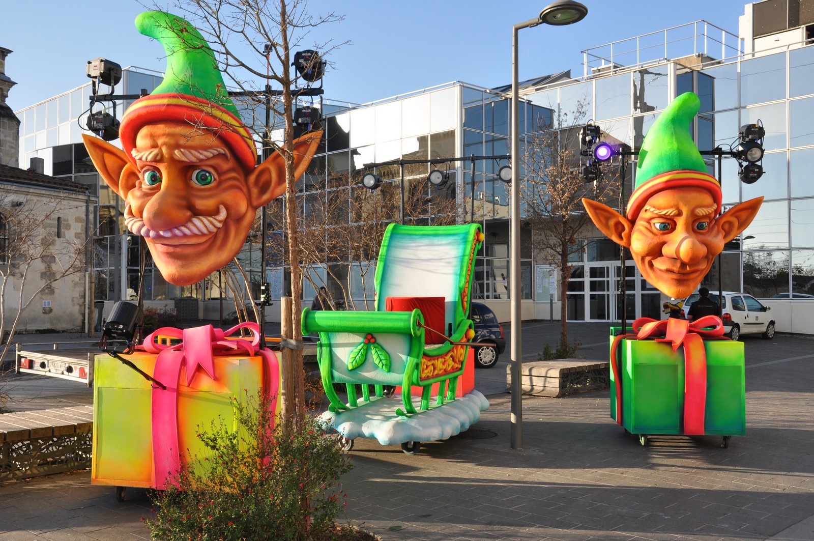 les costumes des différents personnages:mascottes, lutins, grands pantins lutins, fées des glaces, flocons de neige, mais aussi le traineau du Père Noël et sa boite aux lettres, les chariots sonorisés "Cadeaux Lutins" réagissent à la lumière noire créant un effet magique lors du passage de la parade.