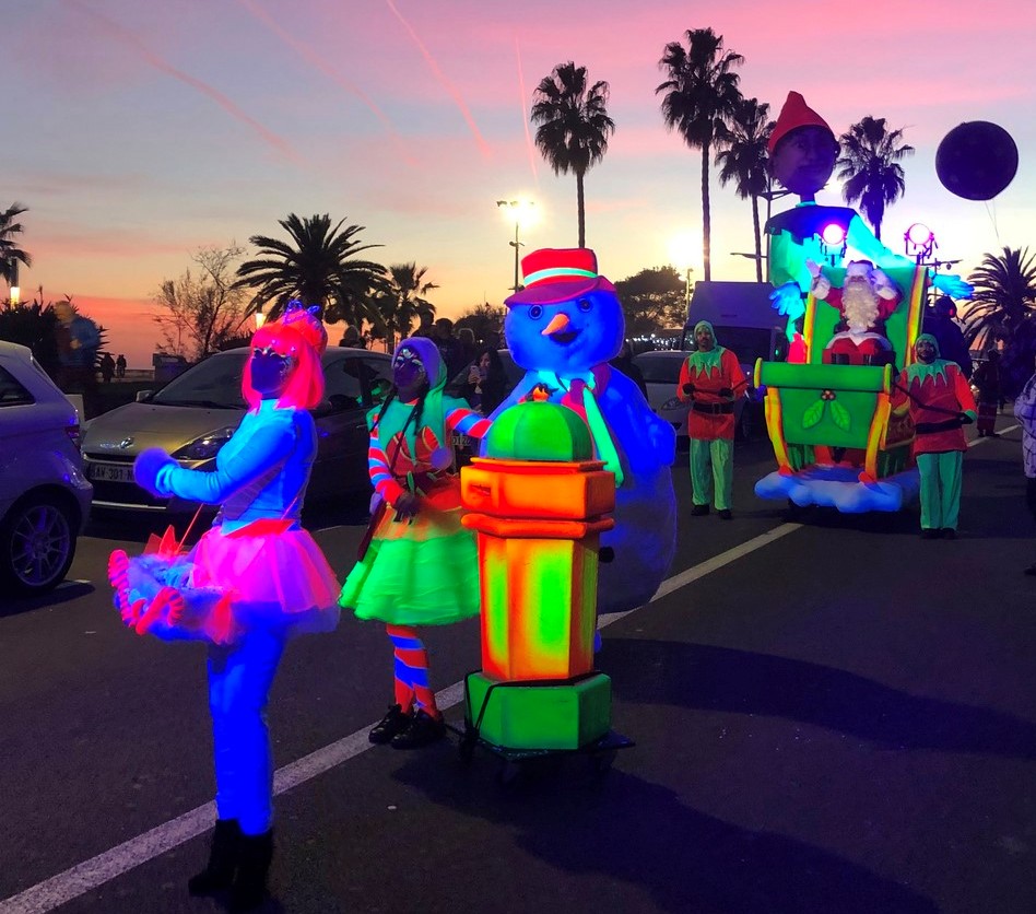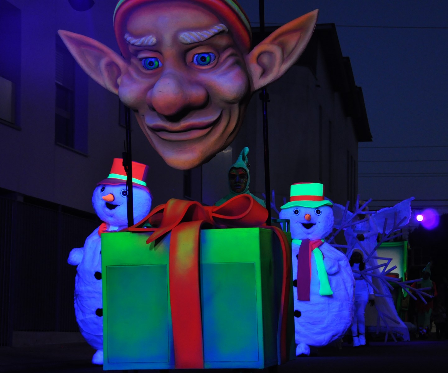 les costumes des différents personnages:mascottes, lutins, grands pantins lutins, fées des glaces, flocons de neige, mais aussi le traineau du Père Noël et sa boite aux lettres, les chariots sonorisés "Cadeaux Lutins" réagissent à la lumière noire créant un effet magique lors du passage de la parade.